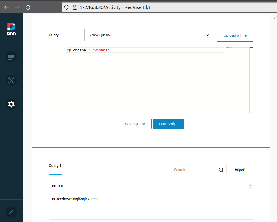 A SQL console is accessible under the Settings page where we can enable xp_cmdshell and run operating system commands. We can first enable this by pasting these lines into the console one by one and clicking Run Script. We won't get any output from each command, but no errors typically means it's working.