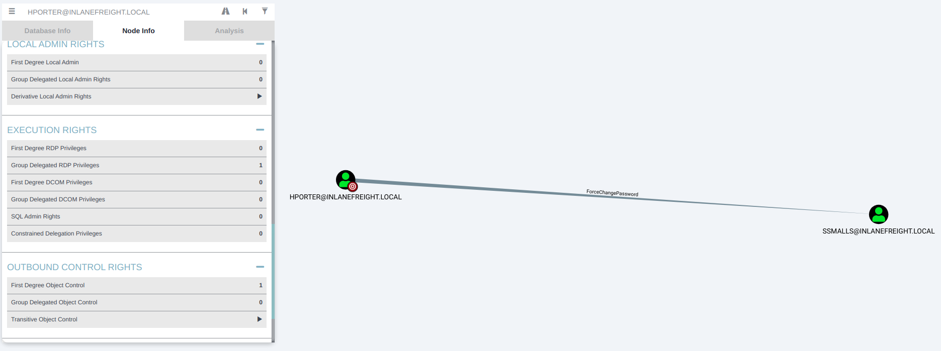 Searching for our user `hporter` and selecting `First Degree Object Control`, we can see that the user has `ForceChangePassword` rights over the `ssmalls` user.