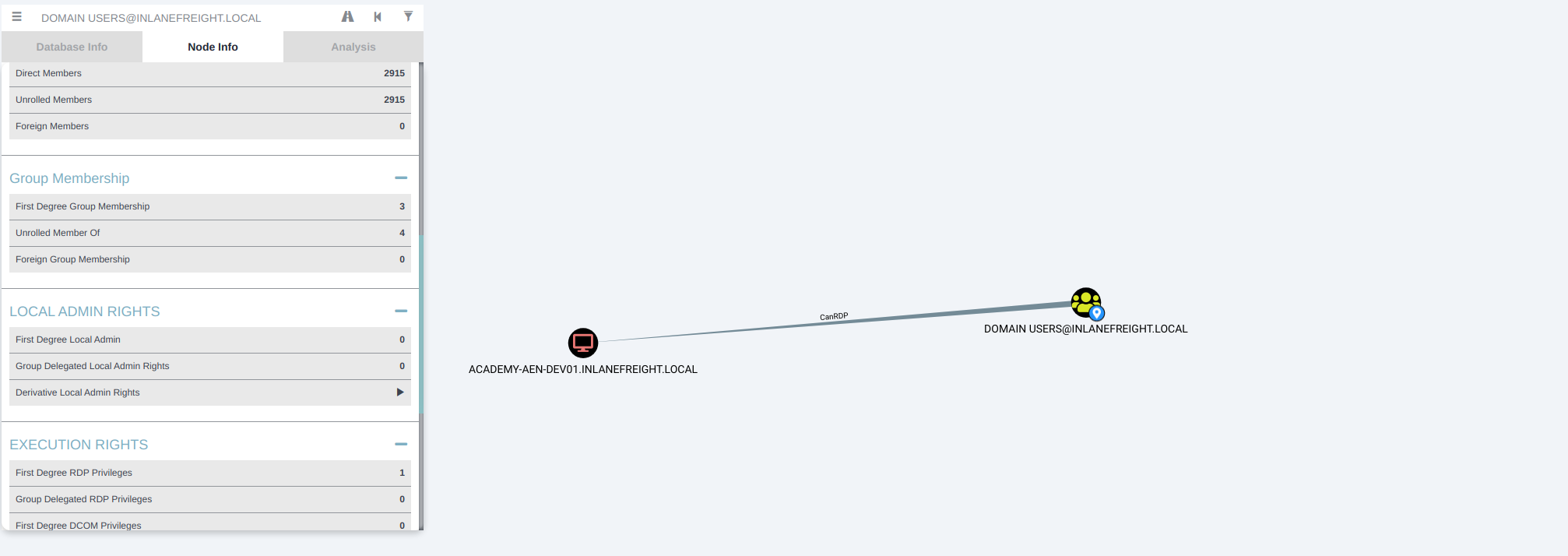 As an aside, we can see that all Domain Users have RDP access over the DEV01 host. This means that any user in the domain can RDP in and, if they can escalate privileges, could potentially steal sensitive data such as credentials. This is worth noting as a finding; we can call it `Excessive Active Directory Group Privileges` and label it medium-risk. If the entire group had local admin rights over a host, it would definitely be a high-risk finding.